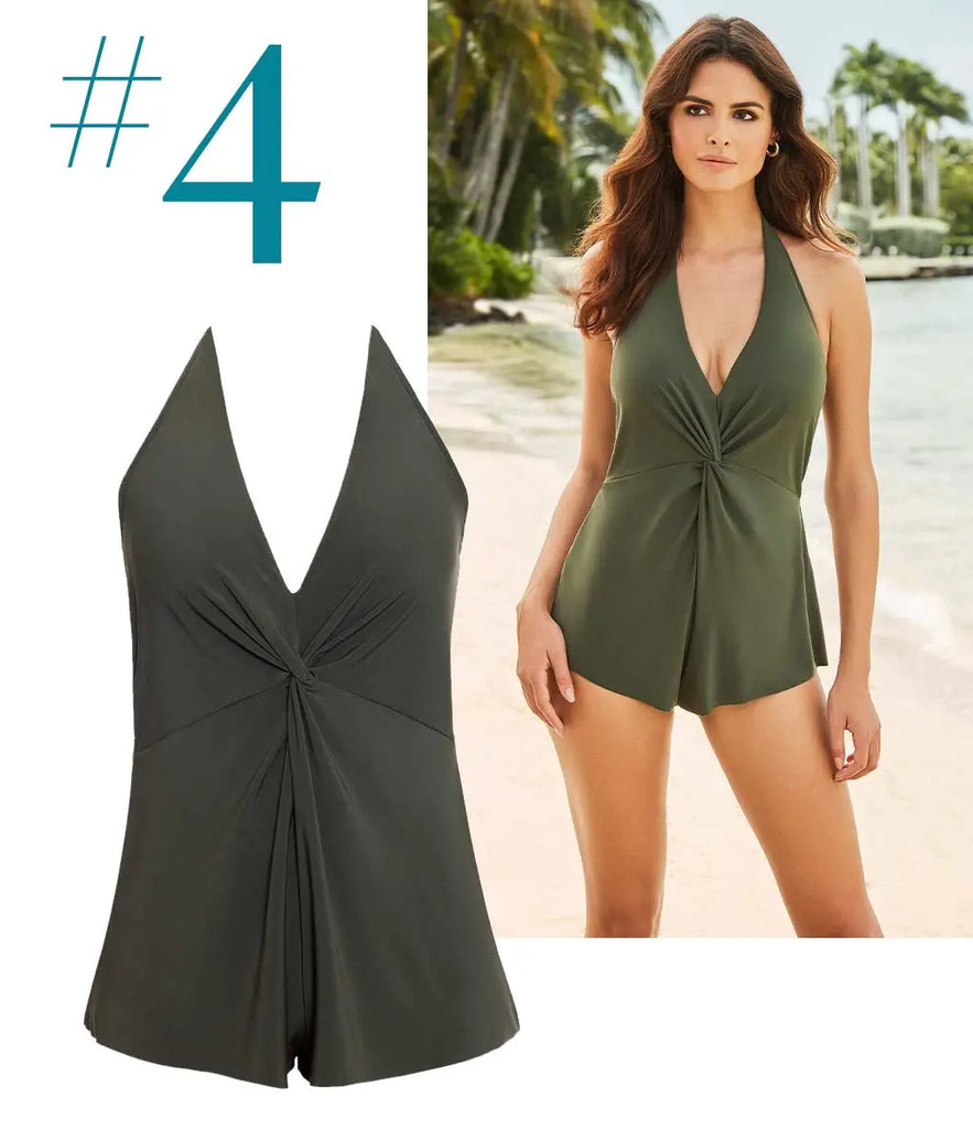 Meet the Magicsuit Bianca Swim Romper: A chic choice with a fashionable halter neckline and an eye-catching decorative tie front. This one-piece swimsuit checks all the boxes you've been looking for – it effortlessly blends style, comfort, and just the perfect level of coverage. What's more, it's thoughtfully available in an extensive range of sizes, including plus sizes.