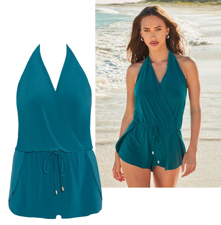 “This suit is so pretty! It has full coverage. Love the halter-style with open back. It was very true-to-size for me. Even though I am 5’3”, the length was just fine and it’s comfortable and flattering.”