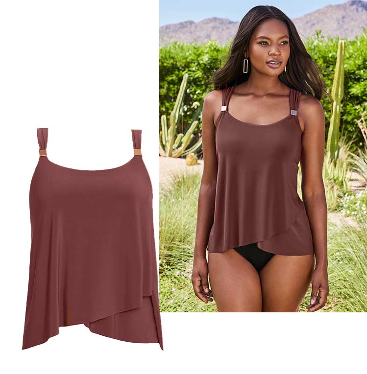Miraclesuit has expertly channeled its immense popularity in crafting one-piece swimsuits into this remarkable tankini design. Top features gracefully draped layers that work their magic to discreetly conceal your tummy, all while providing exceptional support through its incorporated underwire bra. For a perfectly coordinated beach ensemble, pair this exquisite tankini top with the matching swim bottoms. You'll find that this tankini top is nothing short of miraculous, as it offers an unbeatable combination of flattering style, outstanding support, and a lightweight, comfortable fit, making it your go-to choice for a figure-flattering bathing suit.