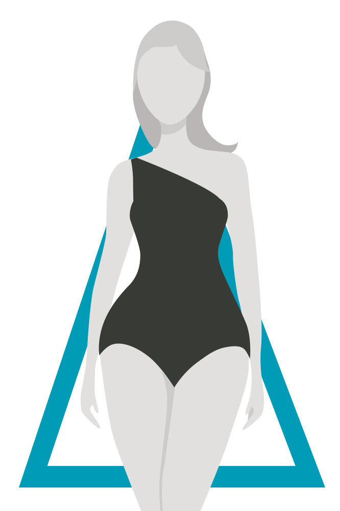 A triangle or pear-shaped figure holds most of its weight in the lower half of the body. This body shape tends to combine wider hips and thighs with a slimmer waist and shoulder area. If you fall into this category, try swimsuits that will accentuate your shoulders and upper body. Features like wider straps and halter tops draw attention to the shoulders, while molded cups fill out your bustline to help balance out your lower body. A statement piece swimsuit can work well for you by drawing the eye upward, and balancing out your figure. Ruffles and detailing at the top of your swimsuit can help create some visual balance.
