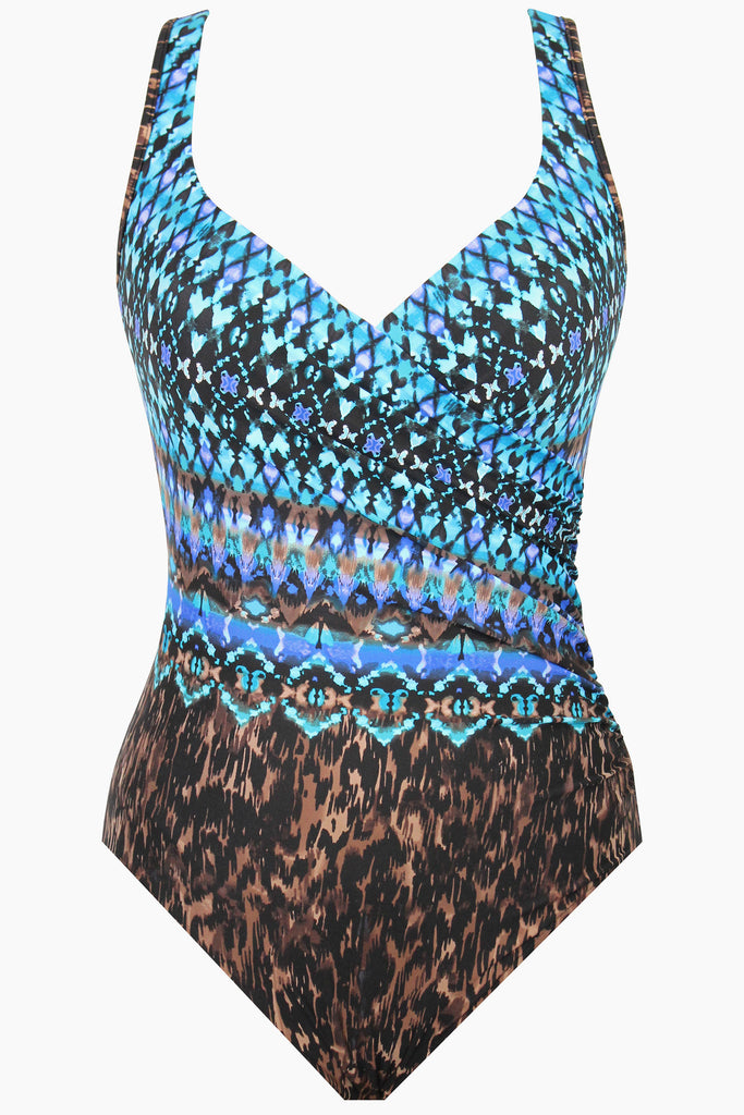 Select a suit with figure-enhancing ruching or wrap-style designs that further define your waist.