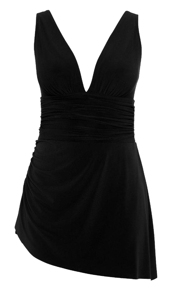 Prepare to make a chic beach entrance while keeping your allure intact – the Magicsuit Celine One-Piece Swimdress is your ultimate solution, offering both coverage and confidence! This swimsuit masterfully strikes the balance between modesty and allure, featuring a convertible dress-style top that elegantly conceals your backside. Whether you opt for a graceful flow or a tantalizing side tie, this swim dress empowers you to choose your level of mystique. Its adjustable straps ensure a personalized fit and support, while the plunging neckline and central ruching enhance your natural curves, sculpting a stunningly feminine silhouette. Available in sizes 8 to 16, and in a timeless black hue, this swim dress is not only versatile but also expertly designed to flatter all women, making it the quintessential choice for your beachwear collection.