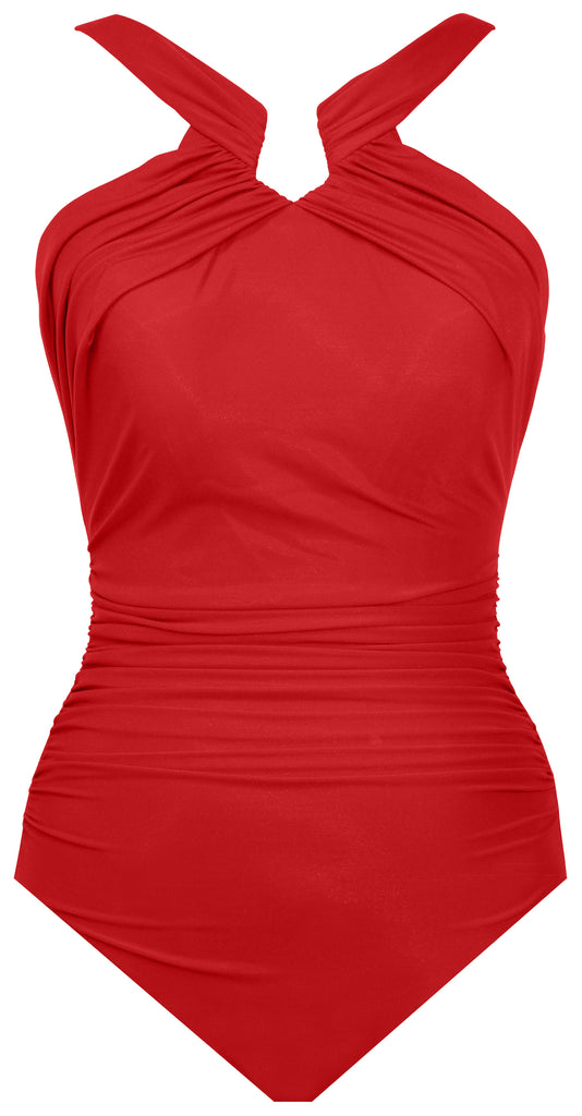 This captivating Rock Solid Aphrodite One Piece swimsuit not only captures the spotlight but also stands as our top-selling masterpiece. Its enchantment lies in its meticulously crafted silhouette, skillfully designed to enhance your curves and elegantly flatter your figure. However, what truly sets it apart is its discreet tummy control feature, a hidden gem that works effortlessly to create a smooth and sculpted appearance. For women over 50, this swimsuit becomes even more extraordinary, as it complements their confidence and offers a flattering, age-appropriate style that exudes grace and allure. Embrace your boldness and revel in the admiration this irresistible red bathing suit will surely command.