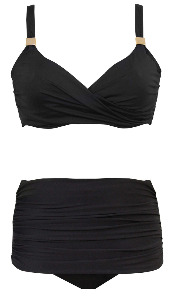 In search of a bikini that seamlessly marries the supportive comfort of a bra with briefs providing full coverage and a touch of tummy-contouring magic? Your quest ends here with this vintage-inspired ensemble, available as separates, and it's truly a game-changer. The Underwire Surplice Bra Top, designed in various cup sizes, not only offers unparalleled support but also features clever draping that imparts a subtle perkiness. With adjustable shoulder straps, you can enjoy a custom fit akin to your favorite bras.