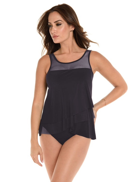 The first tankini on the list, the Miraclesuit Mirage Tankini Top is an instant favorite. Lined with marvelous mesh detail at the bust, this tankini top is a surefire way to get the most out of your swimwear. The higher scoop neckline and hidden underwire bra lead to adjustable shoulder straps that help you get a comfortable fit that is right for you. Front shirring and asymmetric hems tame the tummy and whittle the waist. Elongate your torso while concealing any imperfections in fabric designed to move with your unique shape. You can’t go wrong with this tankini top.