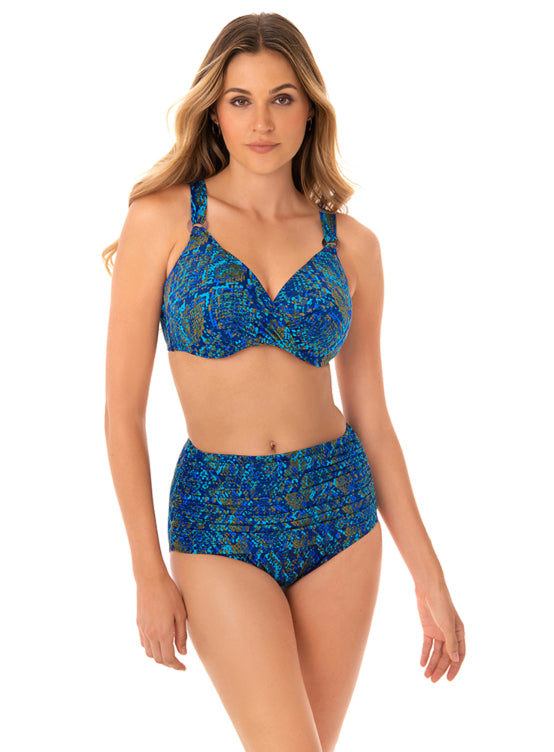 If you want a little something extra, then check out the always-vibrant Miraclesuit Basilisk Plunge Bra Top. This little number features adjustable shoulder straps with added embellishments for flirtatious fun in the sun. The foam cup/hidden underwire keeps the bust fully supported while distinct wrapping keeps all eyes enviously on you. Our seductive snakeskin inspired print of navy, teal and olive green hues form a most perfect combination of slimming hues. If you want to make a statement, then this bikini is the swim to do it in.