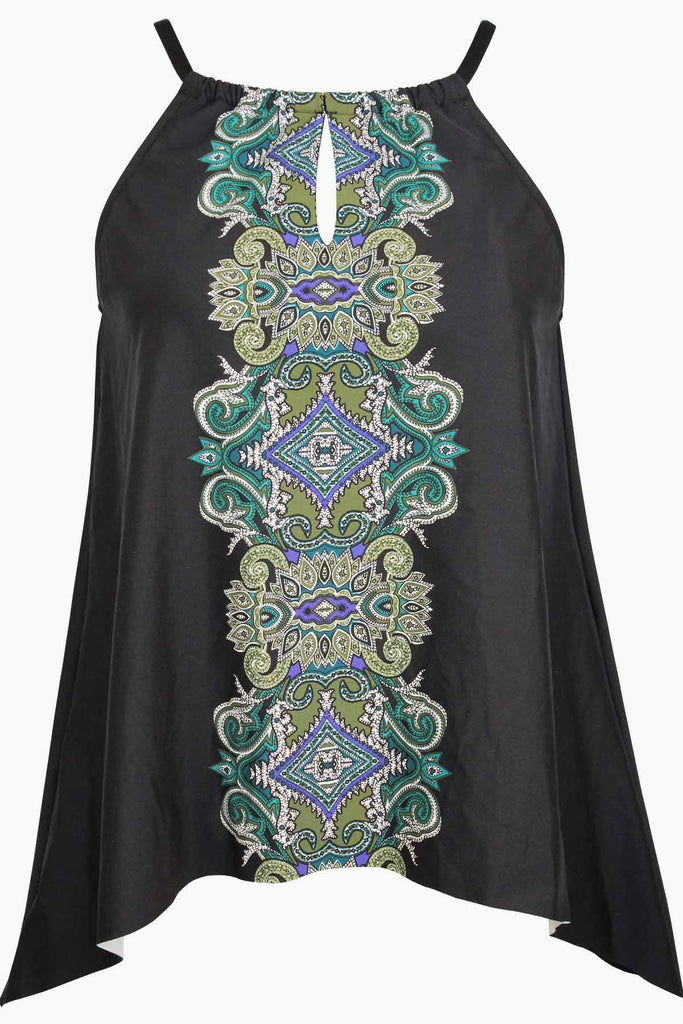 Offered in an array of slimming, timeless styles, the Precioso collection shines in a paisley design of nova, nori, and sangria hues brushed with shimmery silver highlights on classic black. Twists at the necklines, adjustable straps, side shirring, and a shark bite hem are just a few of the highlights in this most precious collection.