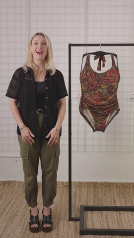This chic one piece features hidden underwire for seamless support, gentle shirring to flatter the waist, and an adjustable halterneck tie for comfort.