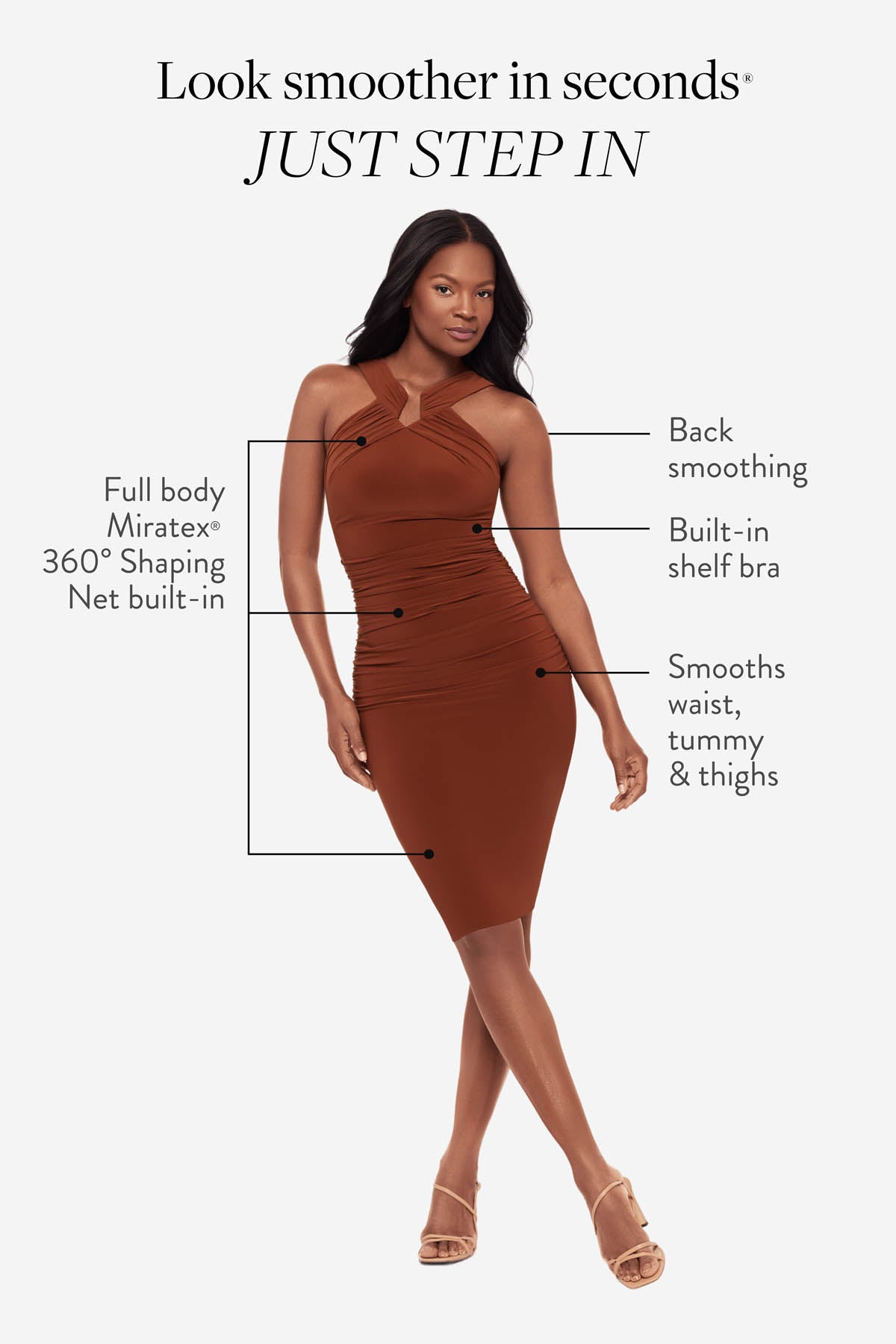 Powered by Miratex® 360° Shaping Net: invisible targeted compression for tummy, waist & thighs. Plus built-in bust support and back smoothing.