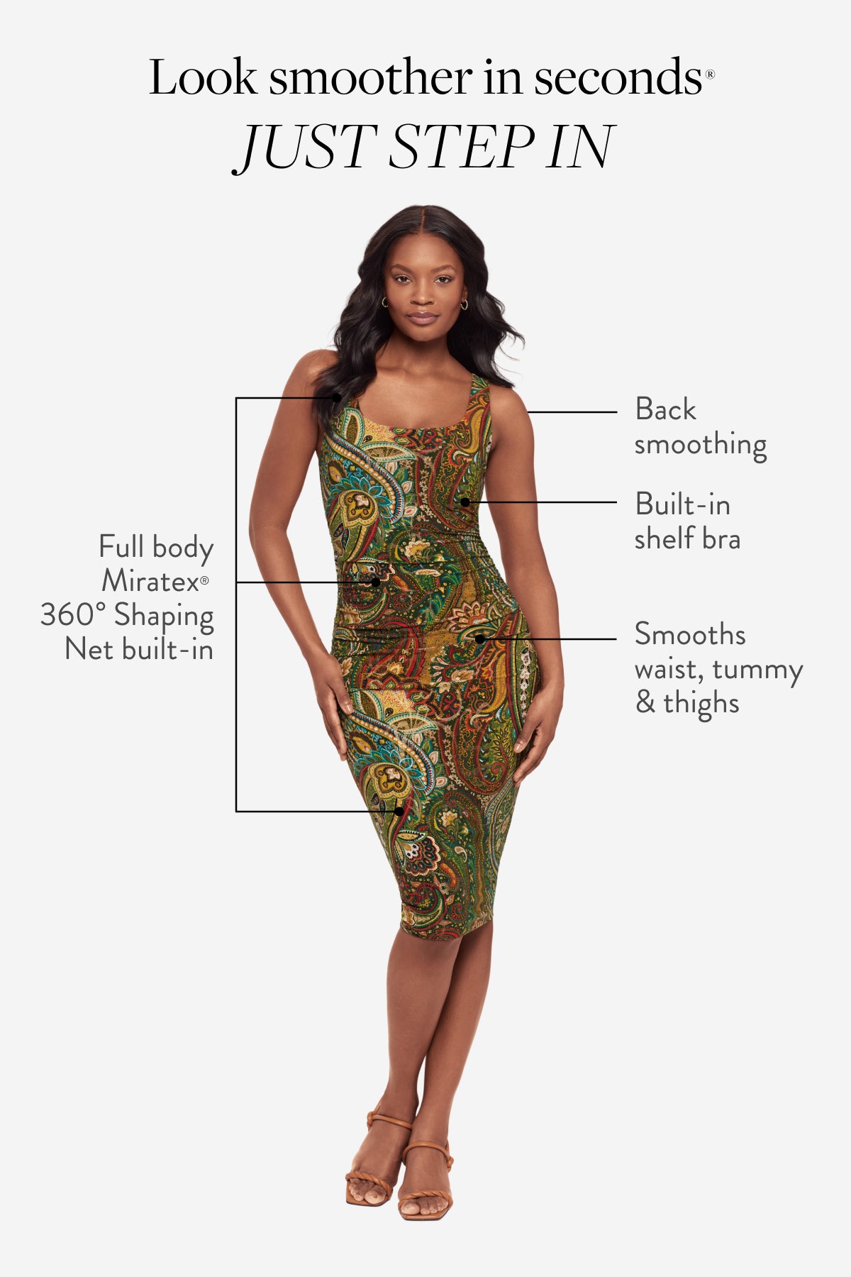 Powered by Miratex® 360° Shaping Net: invisible targeted compression for tummy, waist & thighs. Plus built-in bust support and back smoothing.