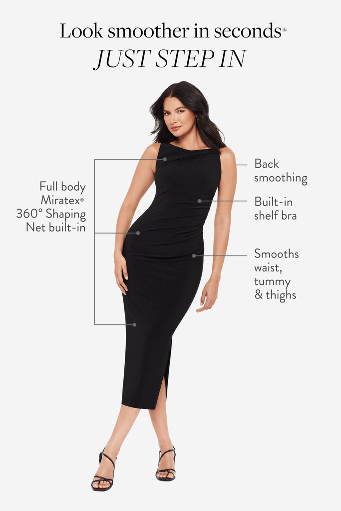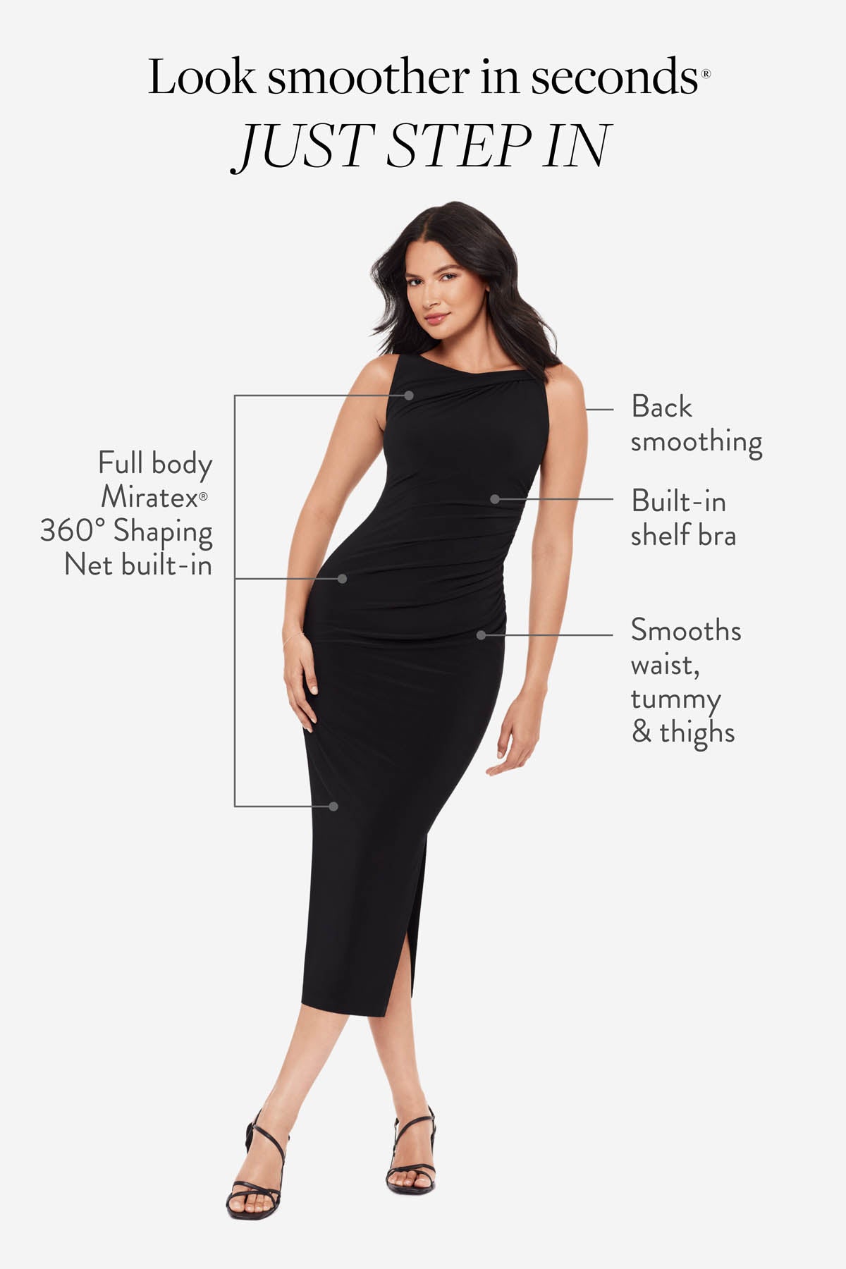 Powered by Miratex® 360° Shaping Net: invisible targeted compression for tummy, waist & thighs. Plus built-in bust support and back smoothing.