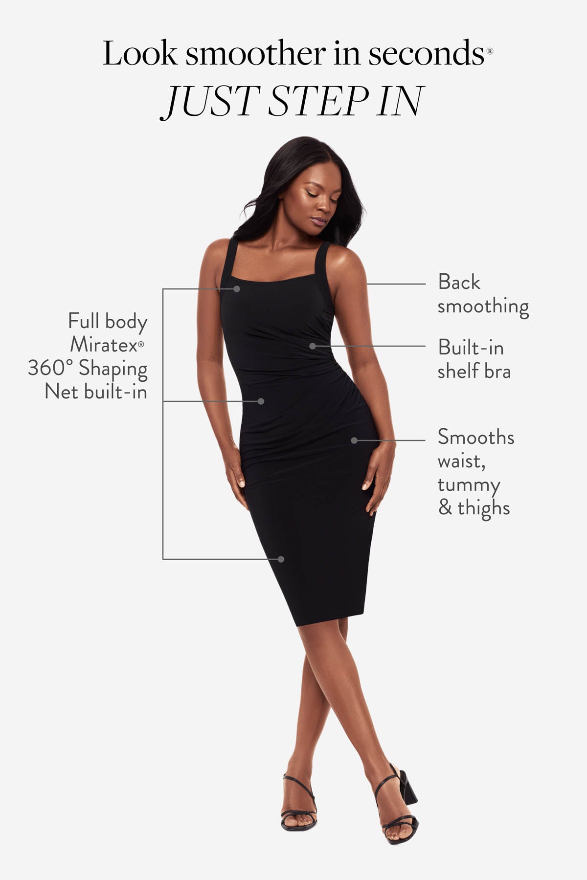 Powered by Miratex® 360° Shaping Net: invisible targeted compression for tummy, waist & thighs. Plus built-in bust support and back smoothing.