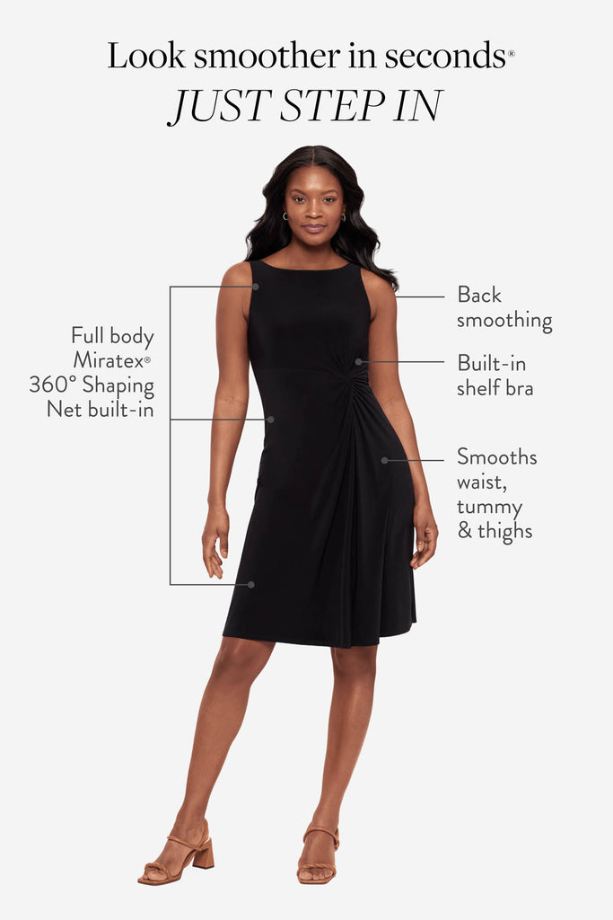 Powered by Miratex® 360° Shaping Net: invisible targeted compression for tummy, waist & thighs. Plus built-in bust support and back smoothing.