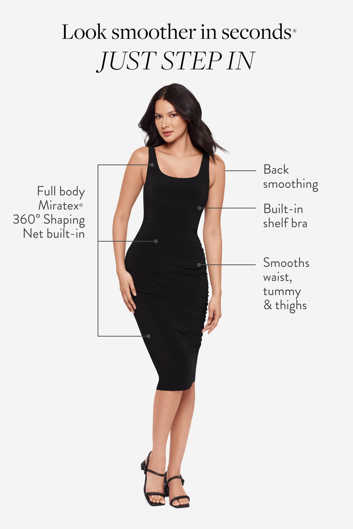 Powered by Miratex® 360° Shaping Net: invisible targeted compression for tummy, waist & thighs. Plus built-in bust support and back smoothing.