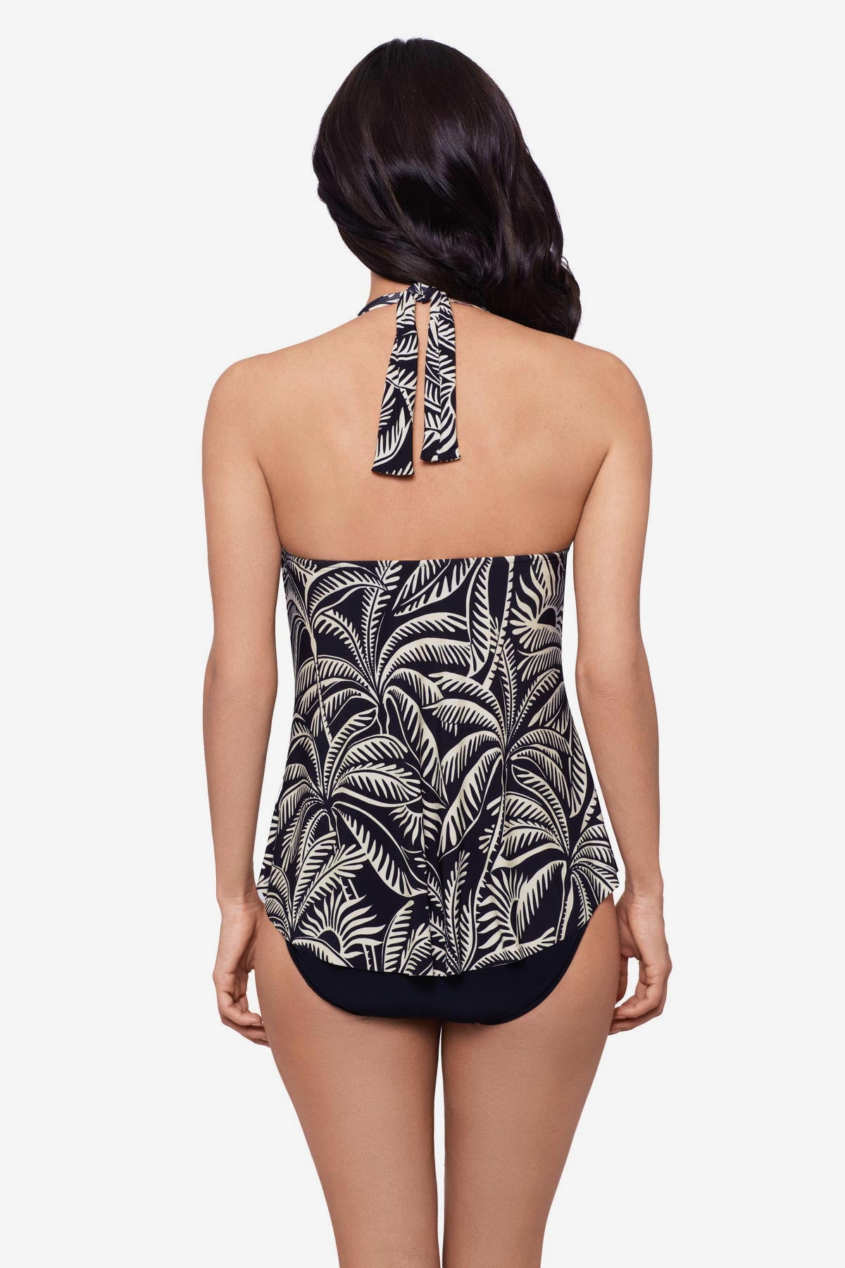 An elegantly draped cowl neck and halter tie combine with a high-low hemline for added coverage and a confidence-boosting fit. Pair with Magicsuit shaping bottoms to complete the look.