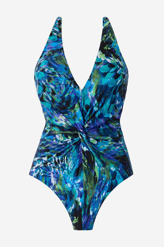 The Drew perfects your hourglass with a front twist illusion, pulling in your waistline. A sleek V-neckline and gorgeous strappy back accent this flattering one piece swimsuit, with removable soft cups underneath.