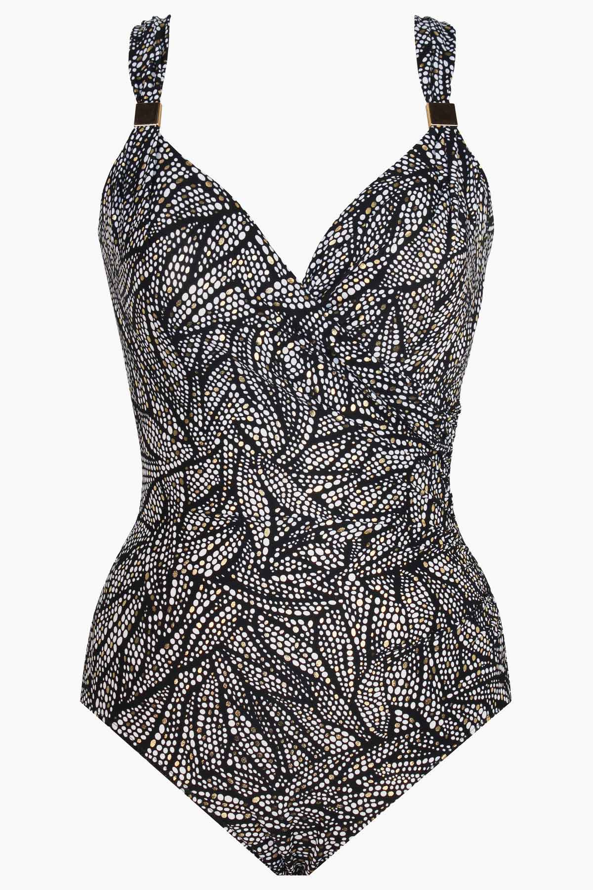 Embody the luxe life as you step onto the sand in a white, black, and gold dotted print of cut out leaves featuring touches of shimmering gold and clever details. With zippers, pleats, shirring, embroidery, and flirty skirts, each swim option in the Shore Leave collection offers something special just for you.