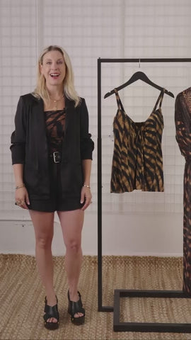 Featured in the Raya de Safari print—dynamic tribal stripes with tones of copper and chocolate.