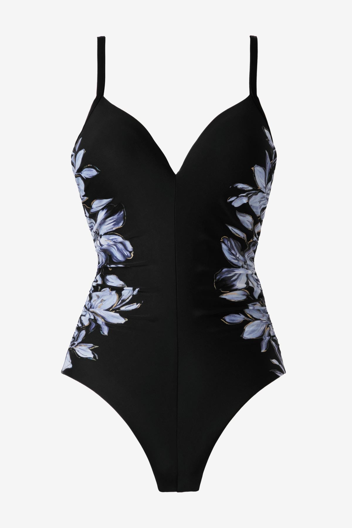 Sculpted by design. This artfully engineered print swimsuit contours your curves with precision. Side shirring adds the perfect cinch, defining your waist.