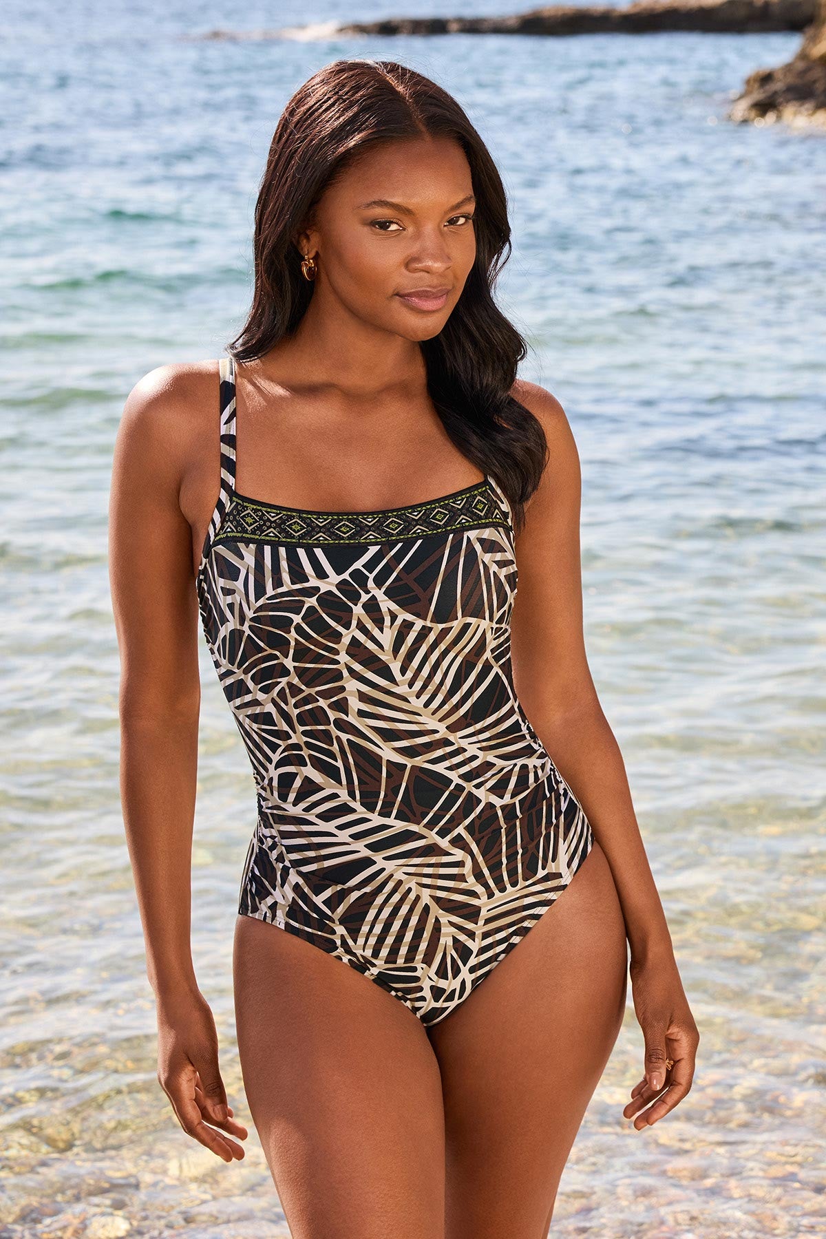 This classic one piece features a square neckline and hidden underwire, engineered with shaping fabric to sculpt and smooth the silhouette.