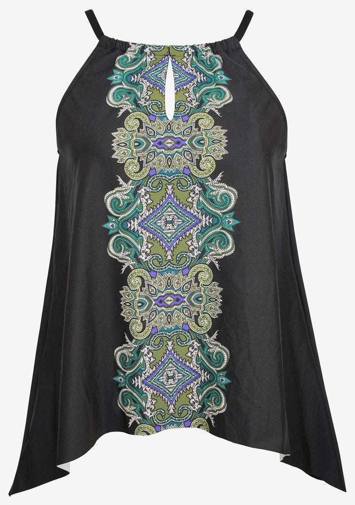 Offered in an array of slimming, timeless styles, the Precioso collection shines in a paisley design of nova, nori, and sangria hues brushed with shimmery silver highlights on classic black. Twists at the necklines, adjustable straps, side shirring, and a shark bite hem are just a few of the highlights in this most precious collection.