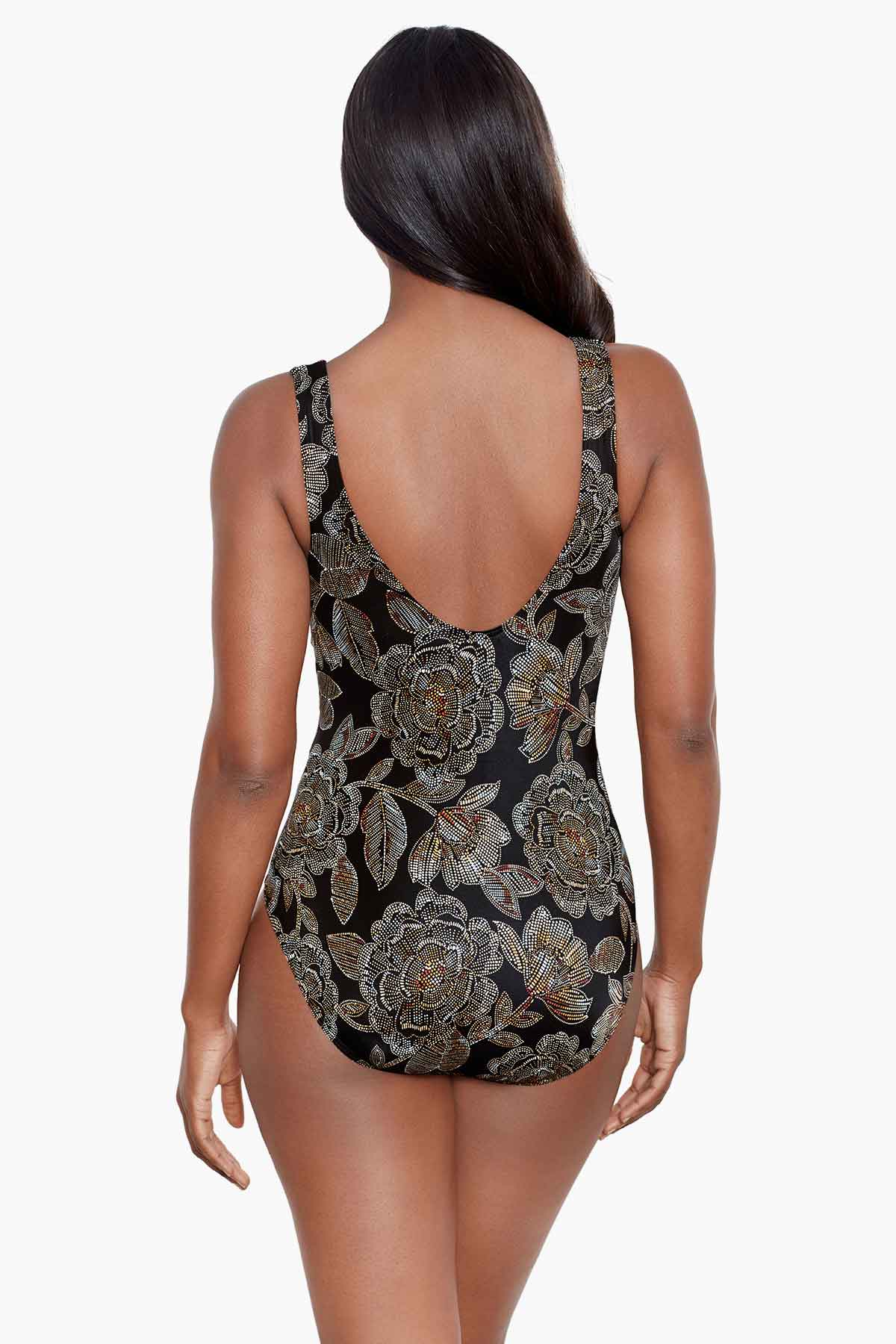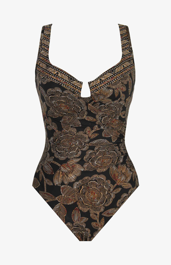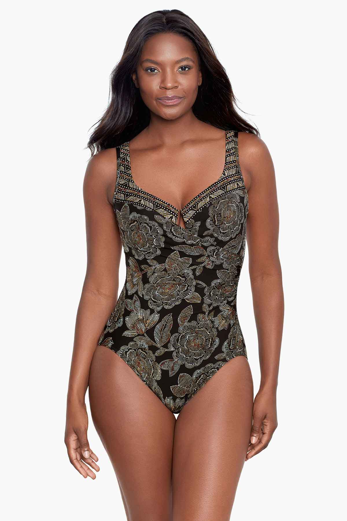 Enticing under the golden sun, the Petal Pusher collection features a delicately placed floral design of golds, ivory, and garnet touches on a black base to cleverly conceal and control. Detailed necklines of shimmery gold draw the eye upward while brand new body Gali has the perfect plunging neckline and is artfully draped to accentuate for the maximum flattering effect.