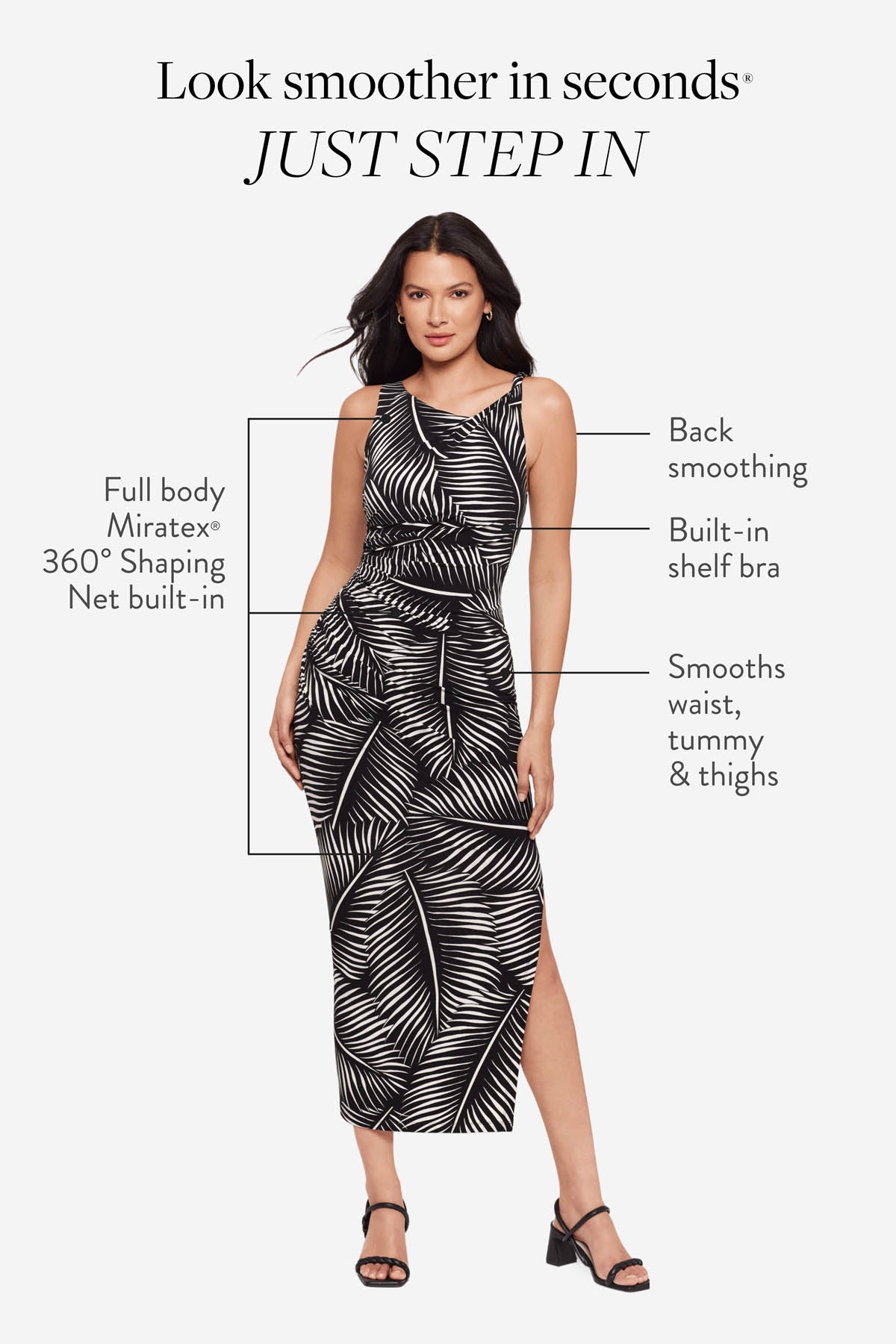 Powered by Miratex® 360° Shaping Net: invisible targeted compression for tummy, waist & thighs. Plus built-in bust support and back smoothing.