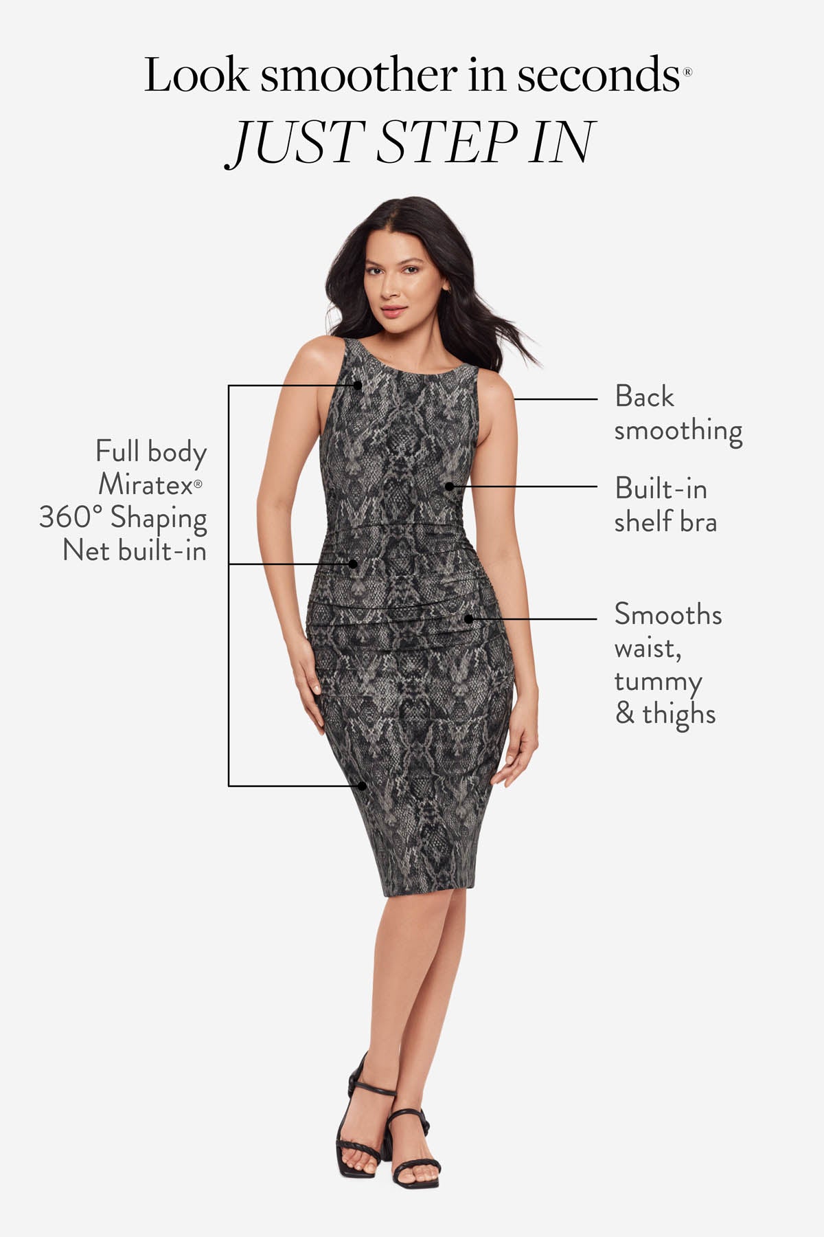 Powered by Miratex® 360° Shaping Net: invisible targeted compression for tummy, waist & thighs. Plus built-in bust support and back smoothing.