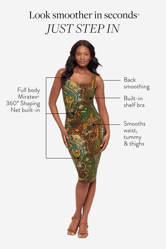 Powered by Miratex® 360° Shaping Net: invisible targeted compression for tummy, waist & thighs. Plus built-in bust support and back smoothing.