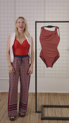 The Avra brings elegance with a unique twisted high neckline and gentle shirring, concealing an underwire bra to support your bust.