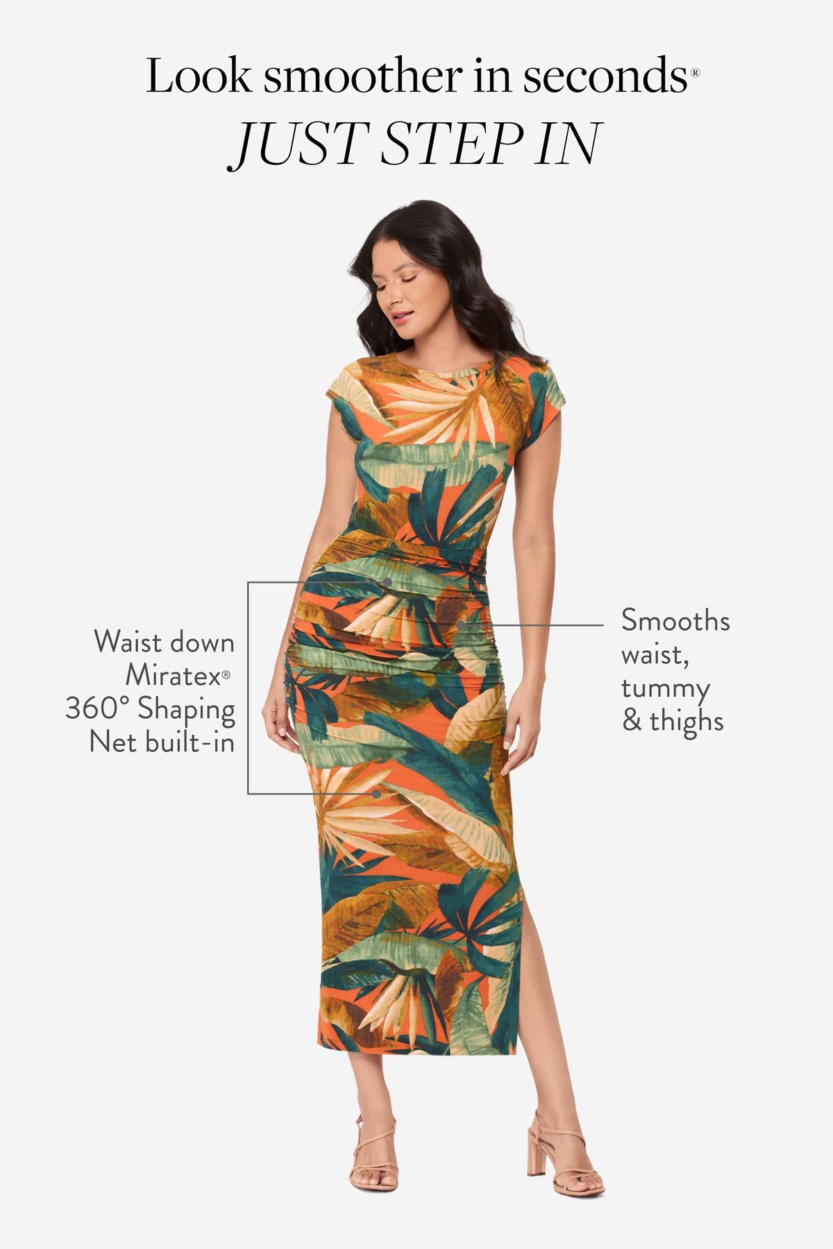 Powered by Miratex® 360° Shaping Net: invisible targeted compression for tummy, waist & thighs.