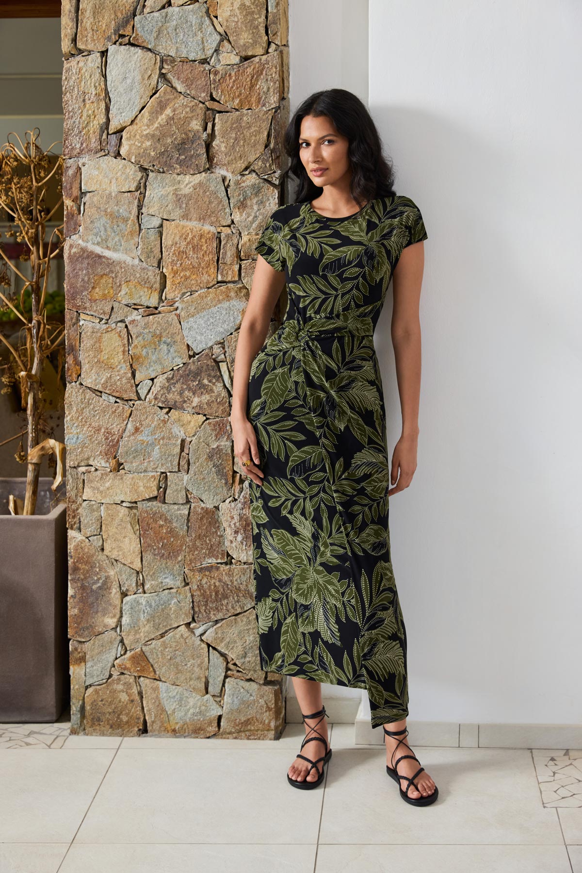 • Faux wrap design with chic waist ring