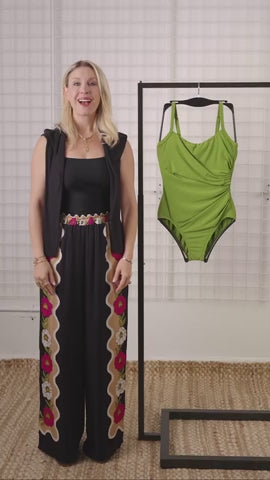This adjustable strap one piece sculpts your shape with hidden underwire support and cinching starburst pleats, finished with a flattering square neckline