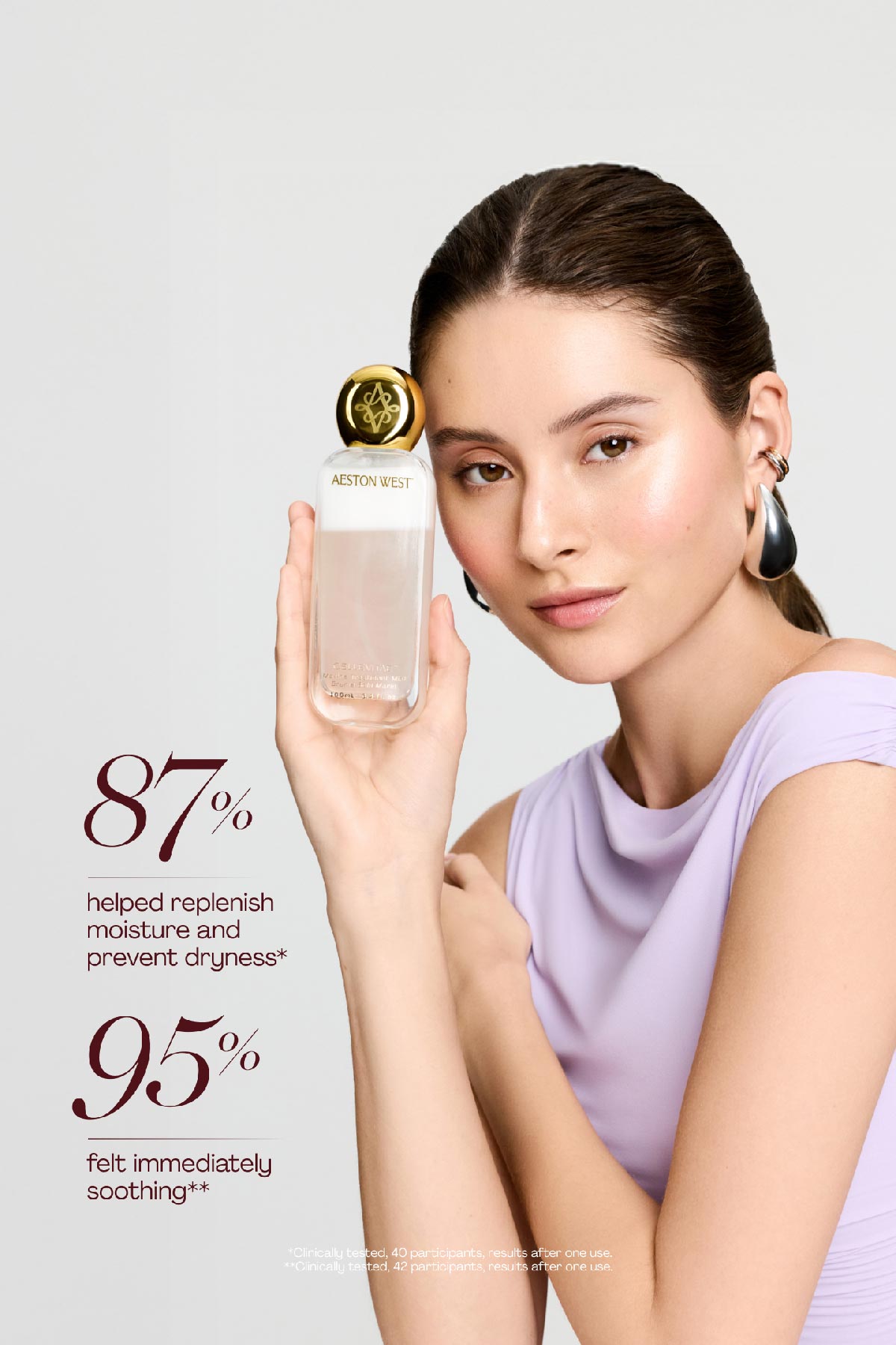 Each step is designed to work in harmony: a nectar-light cleanse that melts into the skin, a bi-phase treatment mist that restores balance and hydration, and a concentrated serème that activates deep renewal.