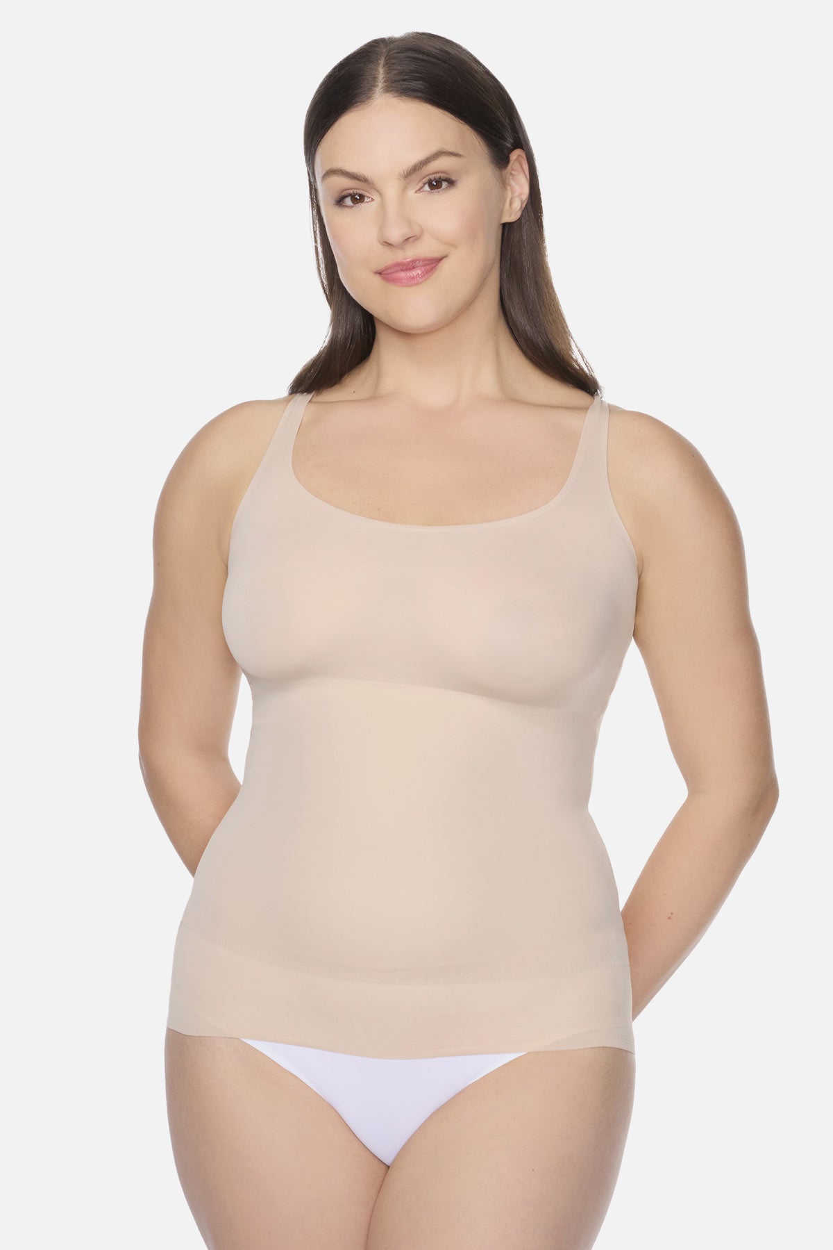• Double shaping panels: On front, upper back, and sides provide extra shaping, flattening, tummy control, and support while keeping you smooth and comfortable.